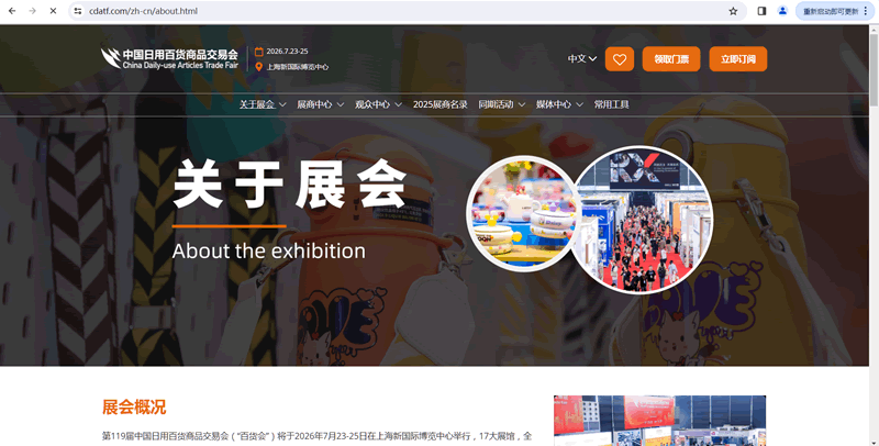 第119届中国日用百货商品交易会(“百货会”)将于2026年7月23-25日在上海新国际博览中心举行,17大展馆,全新启航,涵盖 W1-W5, E1-E7, N1-N5 展馆。本届展会将再创历史新高,10大主题展区引爆采购狂潮,展览面积超20万平方米,参展企业5000余家。东大厅、南大厅、北大厅,三个大厅同时开放,将加速展商与观众报道、注册入场的速度和更好的参展和参观体验。