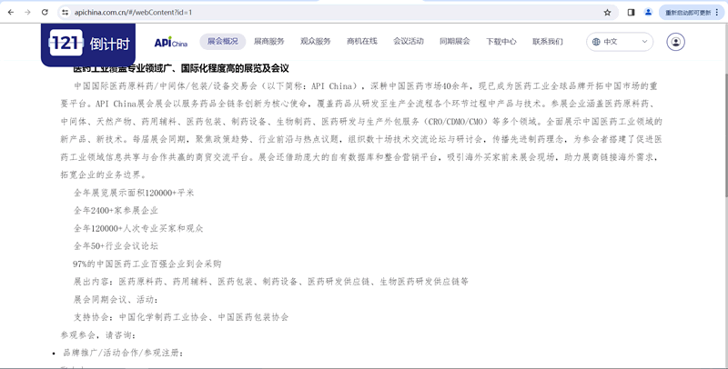 中国国际医药原料药/中间体/包装/设备交易会(以下简称:API China),深耕中国医药市场40余年,现已成为医药工业全球品牌开拓中国市场的重要平台。API China展会展会以服务药品全链条创新为核心使命,覆盖药品从研发至生产全流程各个环节过程中产品与技术。参展企业涵盖医药原料药、中间体、天然产物、药用辅料、医药包装、制药设备、生物制药、医药研发与生产外包服务(CRO/CDMO/CMO)等多个领域。全面展示中国医药工业领域的新产品、新技术。每届展会同期,聚焦政策趋势、行业前沿与热点议题,组织数十场技术交流论坛与研讨会,传播先进制药理念,为参会者搭建了促进医药工业领域信息共享与合作共赢的商贸交流平台。展会还借助庞大的自有数据库和整合营销平台,吸引海外买家前来展会现场,助力展商链接海外需求,拓宽企业的业务边界。