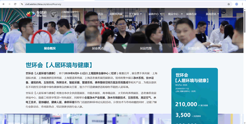 世环会【人居环境与健康】,将于2026年6月9-11日在上海国家会展中心(虹桥)隆重召开,展会携手系列展:上海国际水展、上海暖通舒适系统展、上海管道系统展、上海适老康养展四展联动。现场将集中展示净水系统、饮水设备、建筑机电、五恒系统、热泵技术、智能采暖、管道系统、康养整体空间方案及系统集成等相关产品,为观众提供在不同的生活场景中绿色健康理念的解决方案,致力于打造健康舒适和绿色节能的人居环境。
