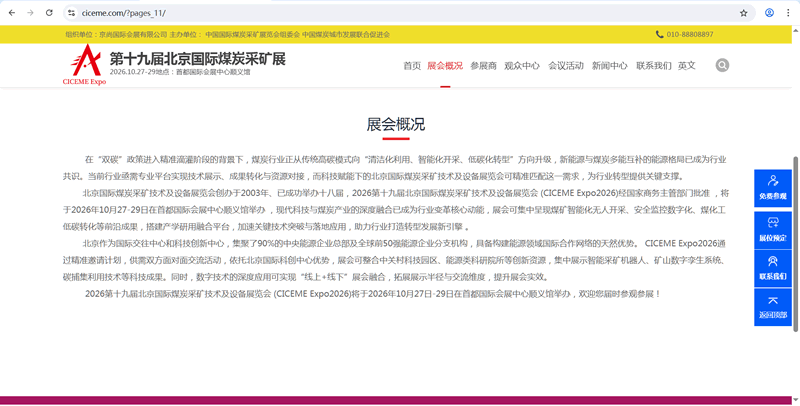 北京国际煤炭采矿技术及设备展览会创办于2003年、已成功举办十八届,2026第十九届北京国际煤炭采矿技术及设备展览会 (CICEME Expo2026)经国家商务主管部门批准 ,将于2026年10月27-29日在首都国际会展中心顺义馆举办 ,现代科技与煤炭产业的深度融合已成为行业变革核心动能,展会可集中呈现煤矿智能化无人开采、安全监控数字化、煤化工低碳转化等前沿成果,搭建产学研用融合平台,加速关键技术突破与落地应用,助力行业打造转型发展新引擎 。