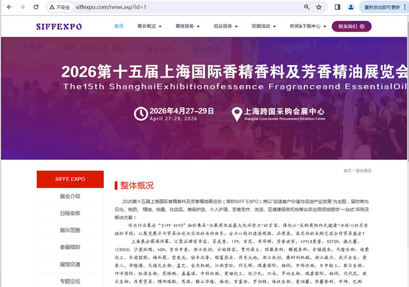 “SIFF EXPO”将于2026年4月27-29日在上海跨国采购会展中心举行,2026第十五届上海国际香精香料及芳香精油展览会(简称SIFF EXPO)将以“创造客户价值与促进产业发展”为主题,届时将为日化、制药、 精油、纯露、化妆品、美容护肤、个人护理、芳香芳疗、洗涤、亚健康服务机构等众多应用领域提供“一站式”采购及解决方案!