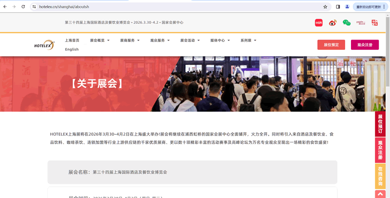 HOTELEX上海展将在2026年3月30~4月2日在上海盛大举办!展会将继续在浦西虹桥的国家会展中心全面铺开,火力全开。同时将引入来自酒店及餐饮业、食品饮料、咖啡茶饮、连锁加盟等行业上游供应链的千家优质展商、更以数十项精彩丰富的活动赛事及高峰论坛为万名专业观众呈现出一场精彩的食饮盛宴!