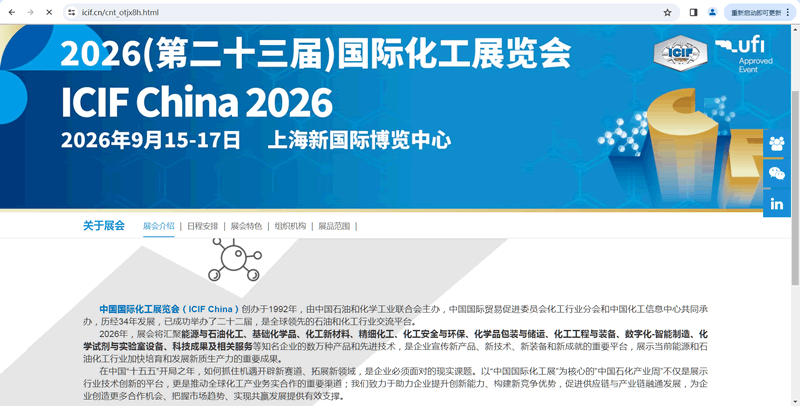 中国国际化工展览会(ICIF China)创办于1992年,由中国石油和化学工业联合会主办,中国国际贸易促进委员会化工行业分会和中国化工信息中心共同承办,历经34年发展,已成功举办了二十二届,是全球领先的石油和化工行业交流平台。