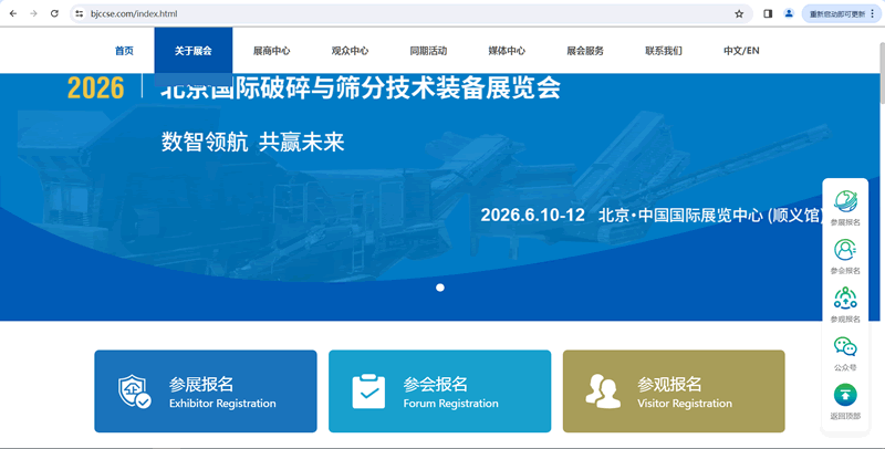 为促进破碎筛分行业高质量稳进发展,推动产业协同与跨界融合,加快技术升级及装备革新,提升企业自主创新能力和产业核心竞争力,由行业权威机构主办,多家行业领军企业鼎力支持的2026北京国际破碎与筛分技术装备展览会(CCSE)将于2026年6月10-12日在北京举办。本届展会将聚焦破碎筛分领域前沿突破、装备革新与产业化实践,整合全球优质资源要素,汇聚国内外破碎筛分装备制造商、技术提供商与配套服务商,携手应用领域优质买家与决策者,共同打造集品牌展示、贸易洽谈、采购对接、资源共享于一体的高水准、专业化、国际化行业盛会,推动破碎筛分产业从“规模效率”向“绿色智能”发展,为我国资源高效开发利用与可持续发展注入行业力量。诚邀全球业界同仁共赴盛会,携手探索行业未来发展的无限可能!