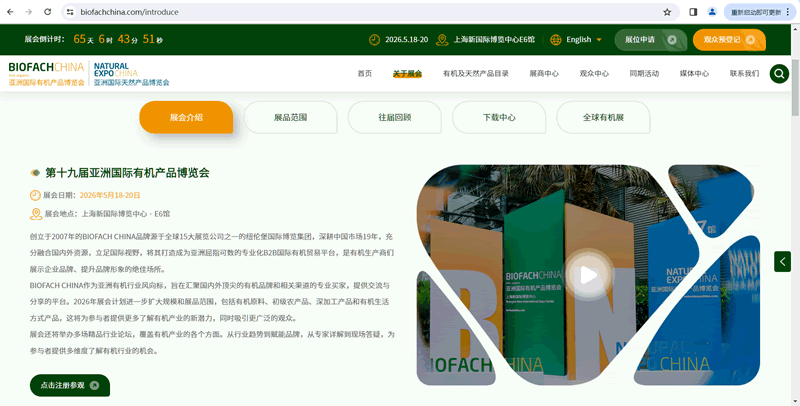 第十九届亚洲国际有机产品博览会2026年5月18-20日上海新国际博览中心E6馆举行,上海奥韵SINCE2007提供BFC展台搭建,亚洲国际有机产品博览会展会设计,上海有机展展会搭建,有机食品展展位设计,有机产品展展台设计搭建服务.