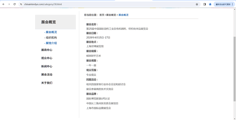 第25届中国国际染料工业及有机颜料、纺织化学品展览会2026.4.15-17上海世博展览馆举行,上海奥韵SINCE2007提供染料展展台设计,助剂展展台搭建,纺织化学品展展位设计,染料工业展展位搭建,有机颜料展展会设计,纺织化学品展展会搭建服务.