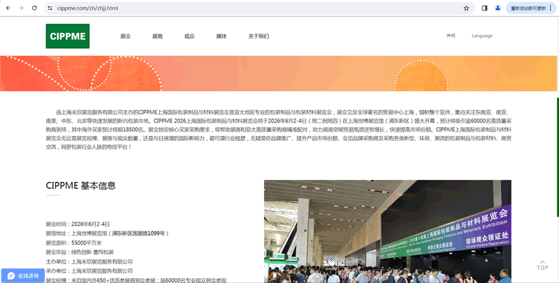 由上海禾欣展览服务有限公司主办的CIPPME上海国际包装制品与材料展览会是亚太地区专业的包装制品与包装材料展览会,展会立足全球著名的贸易中心上海,辐射整个亚洲,重点关注东南亚、南亚、南美、中东、北非等快速发展的新兴包装市场。CIPPME 2026上海国际包装制品与材料展览会将于2026年6月2-4日(周二到周四)在上海世博展览馆(浦东新区)盛大开幕,预计将吸引逾60000名高质量采购商到场,其中海外买家预计将超18500名。展会锁定核心买家采购需求,将帮助展商和亚太高质量采购商精准配对,助力展商突破贸易瓶颈逆势增长,快速提高市场份额。CIPPME上海国际包装制品与材料展览会无论是展览规模、展商与观众数量,还是与日俱增的国际影响力,都可谓行业翘楚,无疑是你品牌推广、提升产品市场份额、会见品牌采购商及采购各类新型、环保、潮流的包装制品与包装材料、商贸交流,网罗包装行业人脉的绝佳平台!