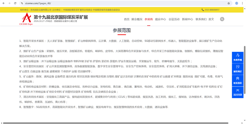 北京国际煤炭采矿技术及设备展览会创办于2003年、已成功举办十八届,2026第十九届北京国际煤炭采矿技术及设备展览会 (CICEME Expo2026)经国家商务主管部门批准 ,将于2026年10月27-29日在首都国际会展中心顺义馆举办 ,现代科技与煤炭产业的深度融合已成为行业变革核心动能,展会可集中呈现煤矿智能化无人开采、安全监控数字化、煤化工低碳转化等前沿成果,搭建产学研用融合平台,加速关键技术突破与落地应用,助力行业打造转型发展新引擎 。